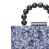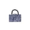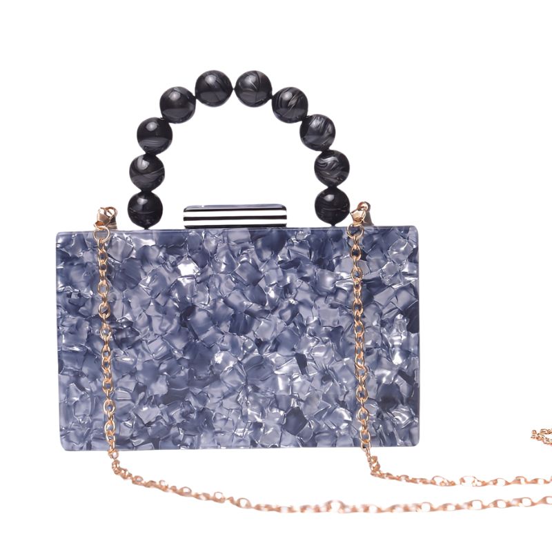 Su diseño estructurado y compacto, realzado por el asa superior adornada con esferas en azul oscuro de efecto marmoleado, logra un balance perfecto entre elegancia clásica y modernidad audaz. La cadena desmontable en tono dorado te permite usarlo al hombro o como bolso de mano, adaptándose a cualquier ocasión o estilo personal.